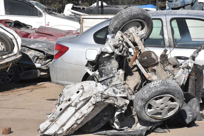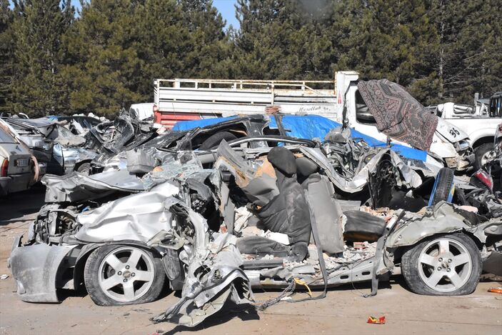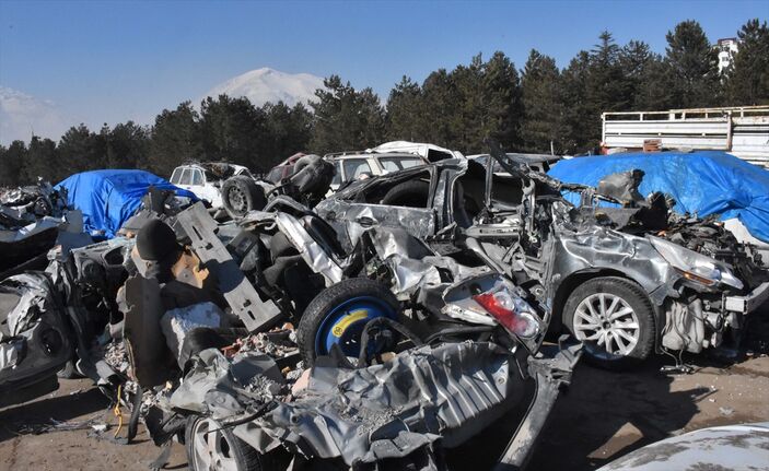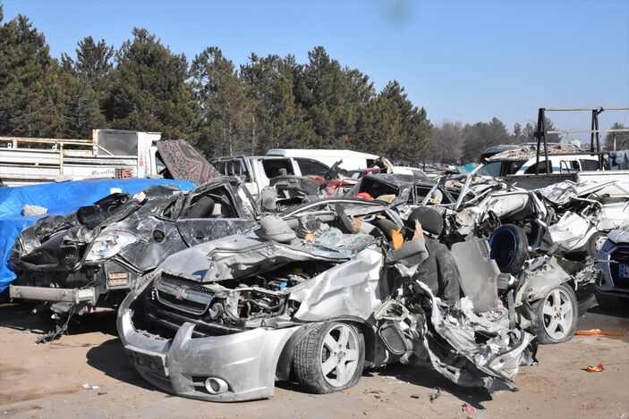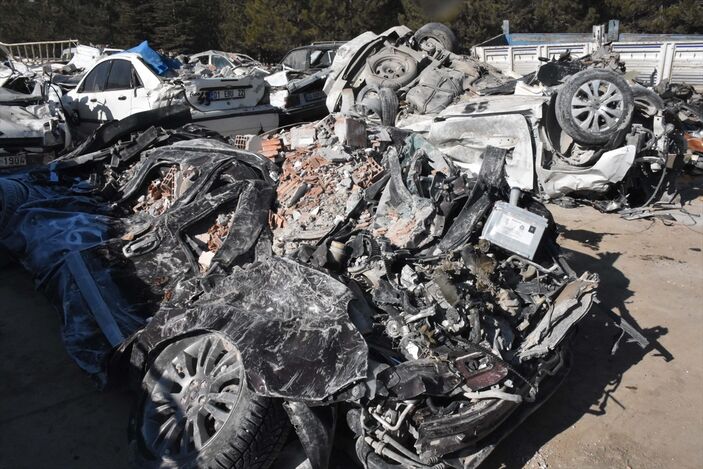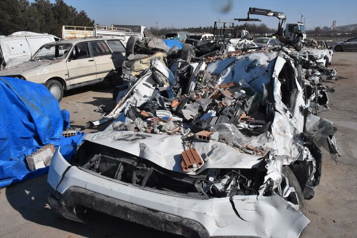 Kaldırılan enkazların altından çıkarılan araçlar, Elbistan-Nurhak kara yolunda bulunan şeker fabrikasının yanında hazırlanan otoparka götürülüyor.