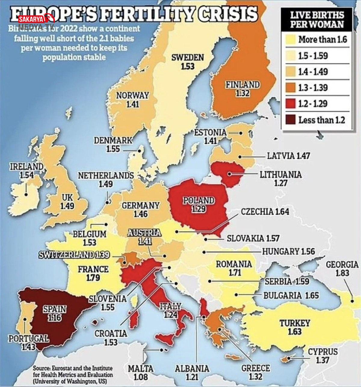 Haritaya nazaran Avrupa’da şu anki nüfusun sabit kalması için ülkelerin bayan başına 2,1 bebek doğum oranına gereksinimi var. Lakin oranlar kritik eşiklerde.