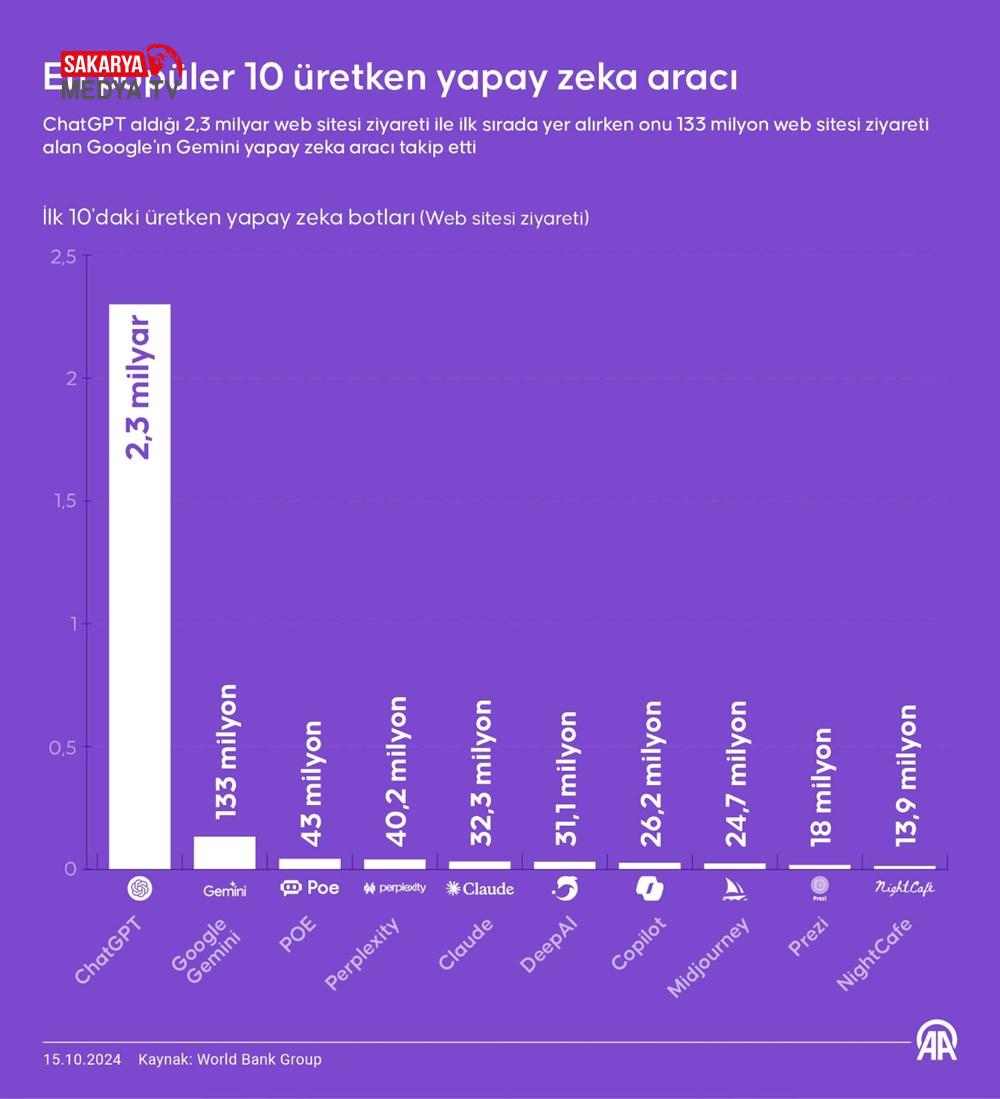 Listede sohbet botu olarak hizmet veren botların üstünlüğü dikkati çekiyor. Listede ilk 7 sırada chatbotlar bulunurken, son 3 sırada ise metinden görsel oluşturan üretken yapay zekalar yer alıyor.