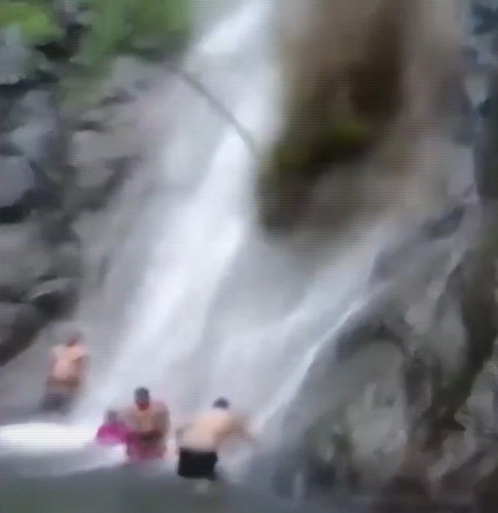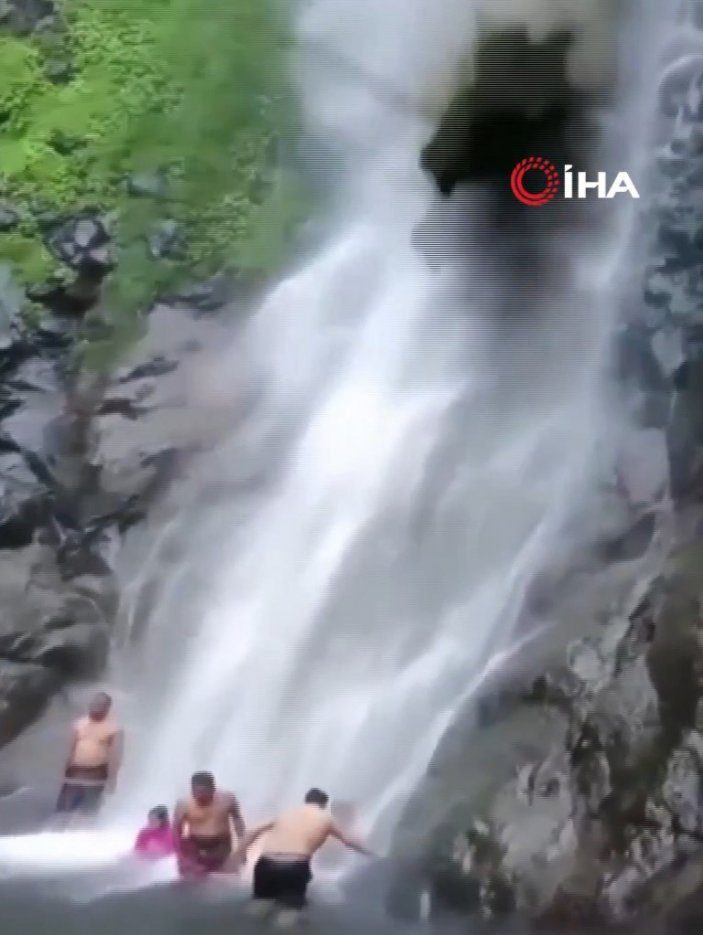 Olay anının kaydedilen görüntülerde, şelalenin altında suya girdikleri sırada aile üyelerinin üzerinde bir anda toprak parçaları ve ağacın düştüğü görüldü.