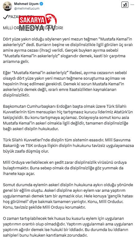 Uçum’un “Pazar yazısı Ulusal ordu göz bebeğimizdir” başlıklı yazısının tamamı şöyle; “Dört yüze yakın olduğu söylenen yeni mezun teğmen “Mustafa Kemal’in askerleriyiz” dedi. Bunların beşine ve disiplinsizlikle ilgili görülen üç sıralı amire ayırma cezası (ihraç) verildi. Gerçek buyken ayırma sebebi “Mustafa Kemal’in askerleriyiz” sloganıdır demek, kasti bir çarpıtma manasına gelir.