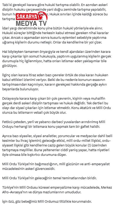 Eğer “Mustafa Kemal’in askerleriyiz” tabiri, ayırma cezasının sebebi olsaydı dört yüze yakın yeni mezun teğmene soruşturma açılması ve hepsinin ihraç edilmesi gerekirdi. Demek ki sorun Mustafa Kemal’in askerleriyiz demek değil, ısrarlı emre itaatsizlikten kaynaklanan disiplinsizliktir. Başkomutan Cumhurbaşkanı Erdoğan başta olmak üzere Türk Silahlı Kuvvetlerinin tüm mensupları hiç tartışmasız kurucu önderimiz Atatürk’ün takipçisidir. Bu mevzu tartışmaya açılamaz. Hasebiyle somut bahis asla Mustafa Kemal’in askeri olmakla ilgili değildir, büsbütün disiplinsizliğe bağlı askeri disiplin hukukudur.