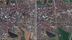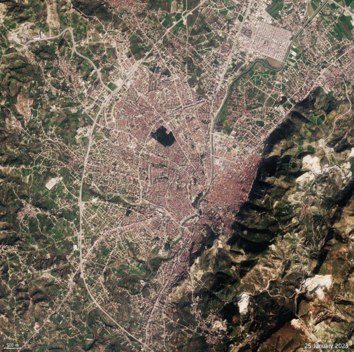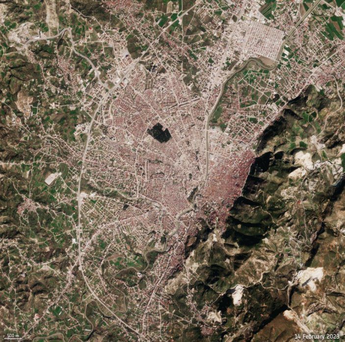 Copernicus Sentinel-2 tarafından çekilen ilk görüntü 25 Ocak 2023 depremi öncesini, ikinci görüntü ise depremden sonra 14 Şubat 2023 yıkımını gösteriyor.
