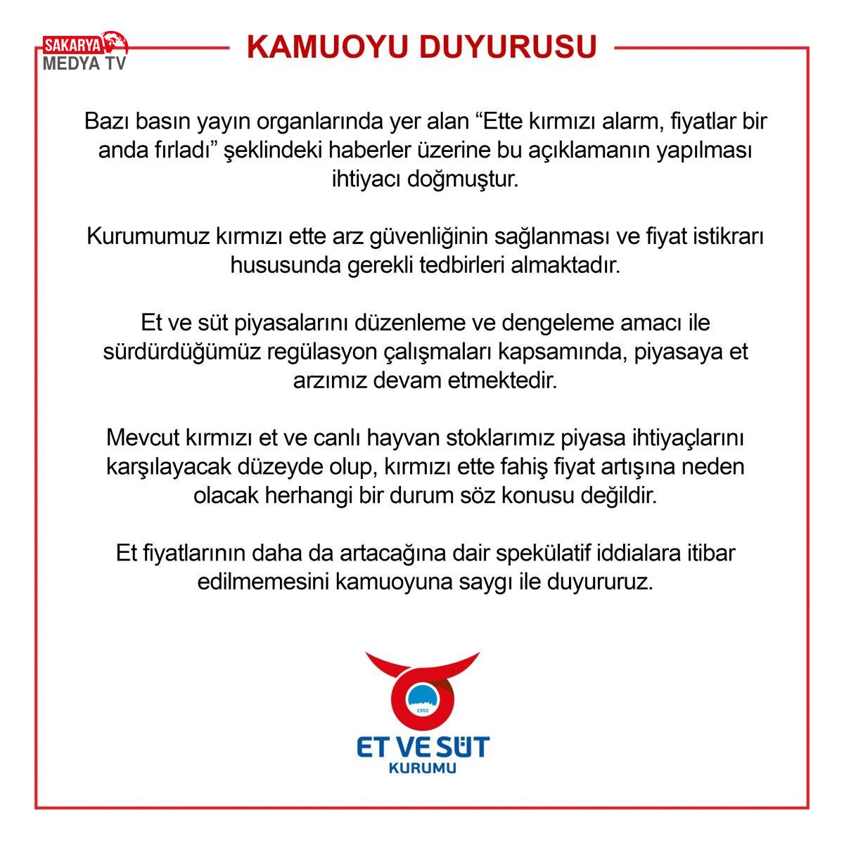 Et ve Süt Kurumu’nun toplumsal medya hesabı üzerinden yaptığı açıklamada şu tabirlere yer verildi:Bazı basın yayın organlarında yer alan “Ette kırmızı alarm, fiyatlar bir anda fırladı” formundaki haberler üzerine bu açıklamanın yapılmasına muhtaçlık doğmuştur. Kumumumuz kırmızı ette arz güvenliğinin sağlanması ve fiyat istikrarı konusunda gerekli önlemleri almaktadır.
