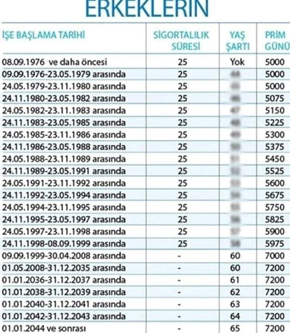 4/a (SSK) sigortalıları için kadınlarda 20, erkeklerde 25 yıllık sigortalılık süresi ve 5000-5975 arasında kademeli prim gün şartlarını taşıyanlar, 4/b (Bağkur) ve 4/c ( Emekli Sandığı) sigortalıları için de kadınlarda 20 tam yıl, erkekler de 25 tam yıl hizmeti olanlar aylık alabilecek.
