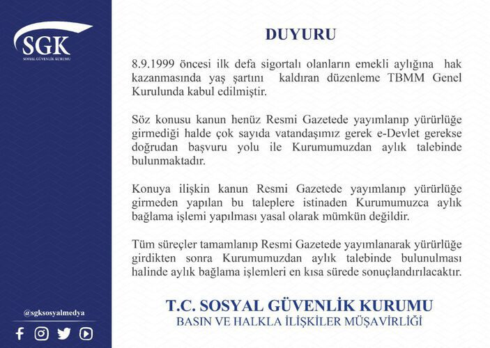 Henüz Resmi Gazete’de yayımlanıp yürürlüğe girmediği halde çok sayıda vatandaşın gerek e-Devlet gerekse doğrudan başvuru yolu ile kurumdan aylık talebinde bulunmasıyla ilgili yapılan açıklamada şöyle denildi: