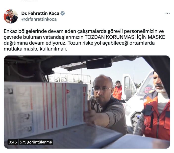 “Enkaz bölgelerinde devam eden çalışmalarda görevli personelimizin ve çevrede bulunan vatandaşlarımızın tozdan korunması için maske dağıtımına devam ediyoruz. Tozun riske yol açabileceği ortamlarda mutlaka maske kullanılmalı.”