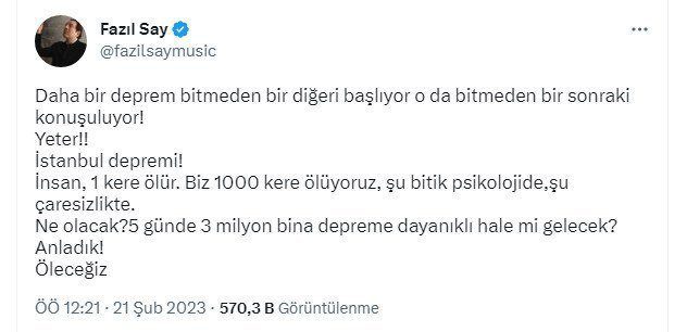 ”Daha bir deprem bitmeden bir diğeri başlıyor o da bitmeden bir sonraki konuşuluyor! Yeter! İstanbul depremi! İnsan, 1 kere ölür. Biz 1000 kere ölüyoruz, şu bitik psikolojide, şu çaresizlikte. Ne olacak? 5 günde 3 milyon bina depreme dayanıklı hale mi gelecek? Anladık! Öleceğiz”