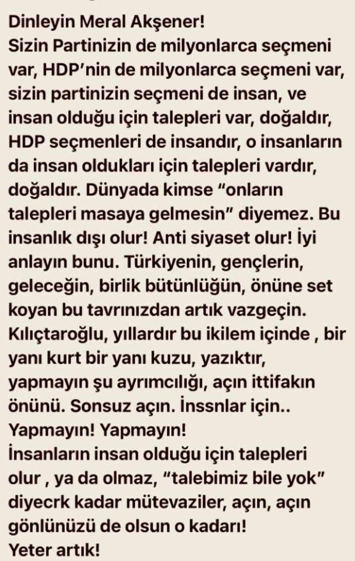 Son olarak Meral Akşener’in açıklamalarına da kayıtsız kalamayan Say, bu kez sosyal medya hesabından yaptığı paylaşımla çağrıda bulundu. Fazıl Say’ın paylaşımda şu ifadeler yer aldı:Dinleyin Meral Akşener: Sizin partinizin de milyonlarca seçmeni var; HDP’nin de milyonlarca seçmeni var. Sizin partinizin seçmeni de insan ve insan oldukları için talepleri var; doğaldır… HDP seçmenleri de insandır. O insanların da insan oldukları için talepleri vardır; doğaldır. Dünyada kimse ‘Onların talepleri masaya gelmesin’ diyemez.