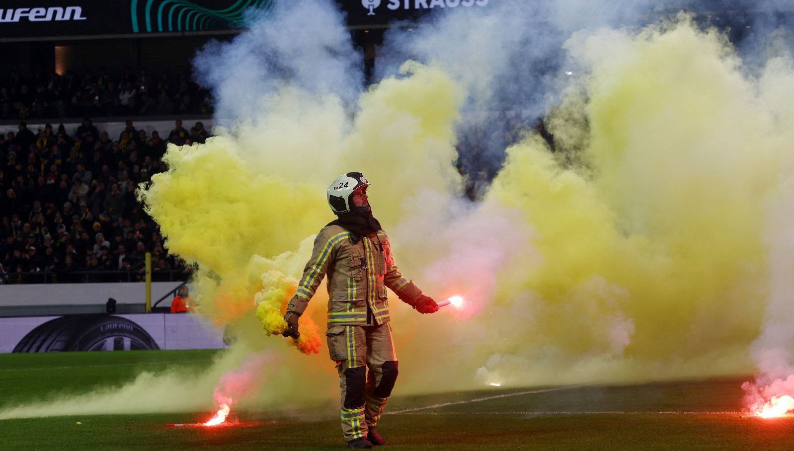 Fenerbahçeli taraftarlardan Union Saint-Gilloise maçında sahaya yabancı madde ve meşale