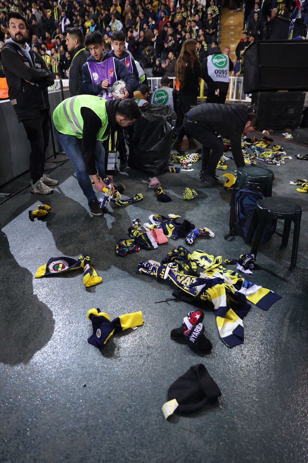 “Türkiye Üşüme Fenerbahçe Seninle” şeklinde tezahüratta bulunan sarı-lacivertli taraftarlar, yanlarında getirdikleri atkı, bere ve eldivenleri deprem bölgesine gönderilmesi için stat zeminine attı.