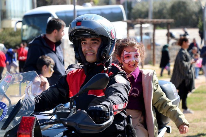 Yüzleri boyanan çocuklar daha sonra polis motosikletiyle parkta gezdirildi.