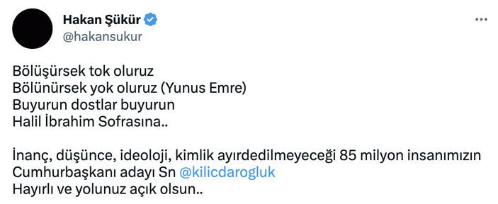 İlk olarak sosyal medya hesabından açıklama firari FETÖ’cü Hakan Şükür, büyük mutluluk yaşadığını belirterek şu ifadeleri kullandı:İnanç, düşünce, ideoloji, kimlik ayırt edilmeyeceği 85 milyon insanımızın