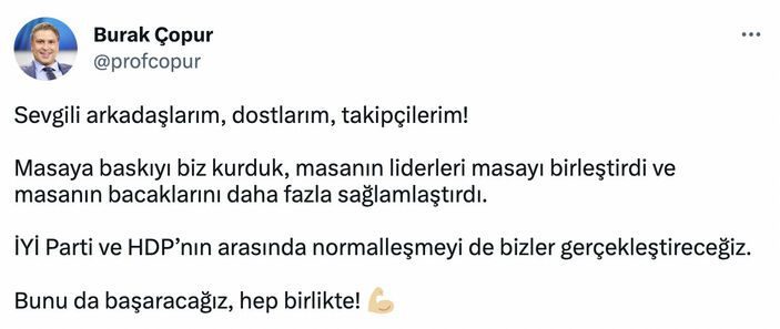 Skandal açıklamalarına devam eden Çopur, İyi Parti ve HDP arasındaki birlikteliği sağlayacaklarını belirterek şu ifadeleri kullandı:Sevgili arkadaşlarım, dostlarım, takipçilerim. Masaya baskıyı biz kurduk, masanın liderleri masayı birleştirdi ve masanın bacaklarını daha fazla sağlamlaştırdı.