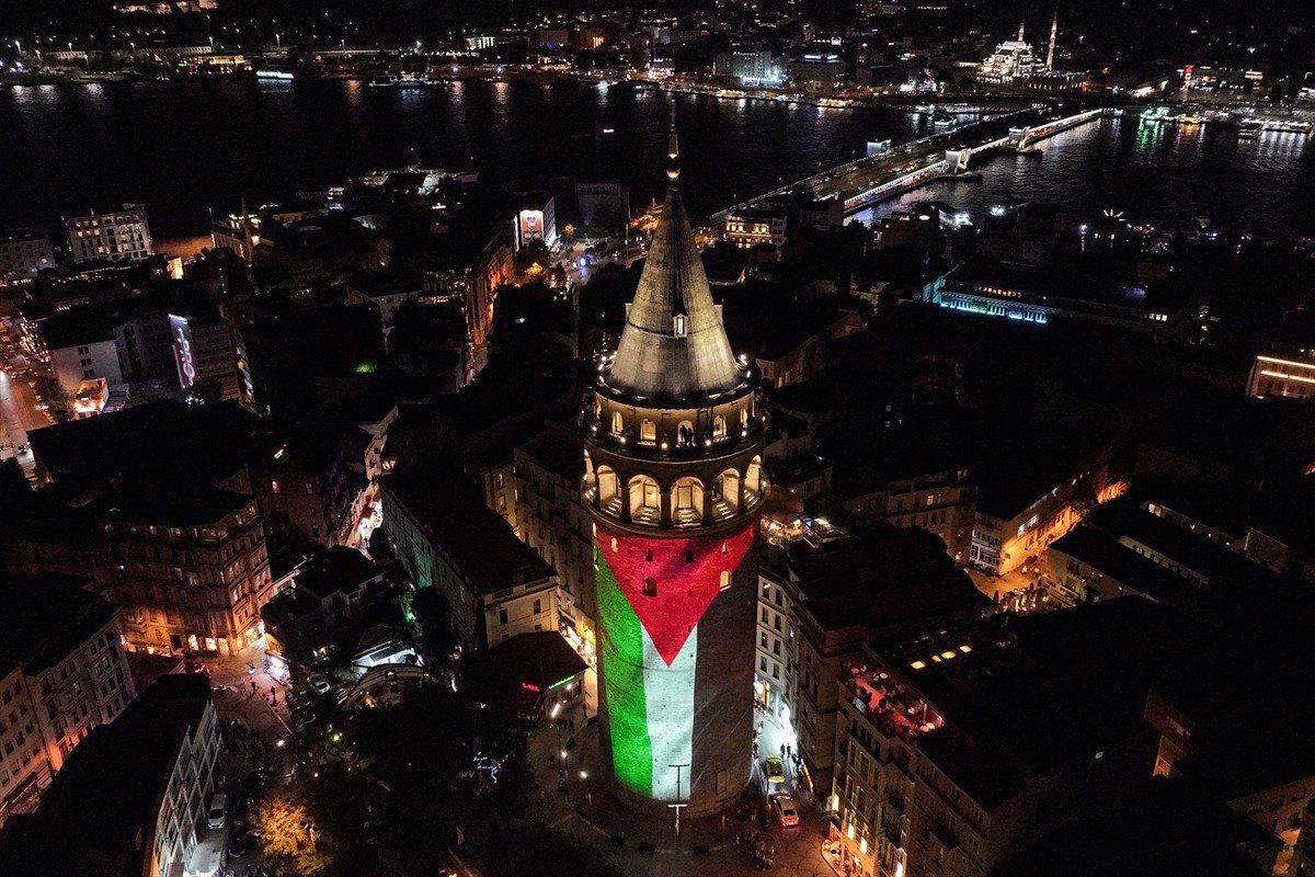 İstanbul’un simge yapılarından Galata Kulesi, Kültür ve Turizm Bakanlığı tarafından Filistin’e destek emeliyle ve İsrail’in bir yıldır süren ataklarına dikkat çekmek için Filistin bayrağı renkleriyle aydınlatıldı.