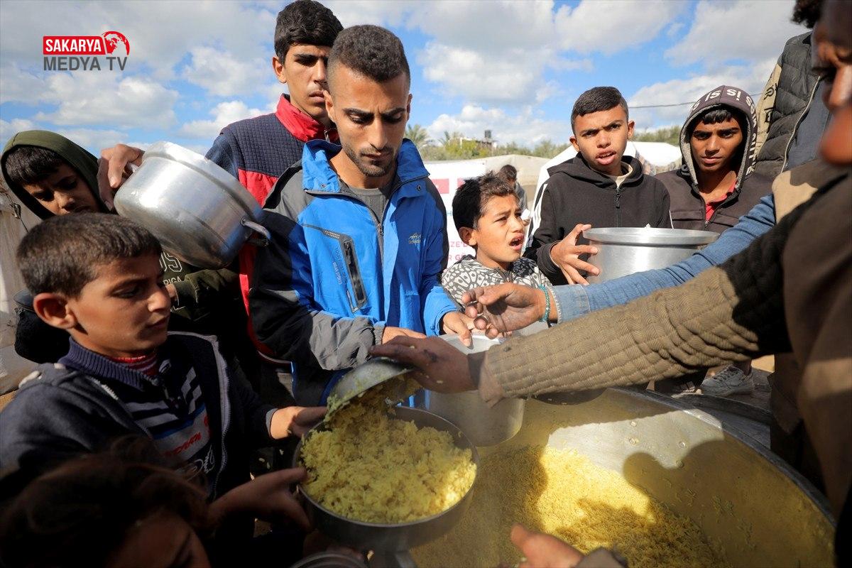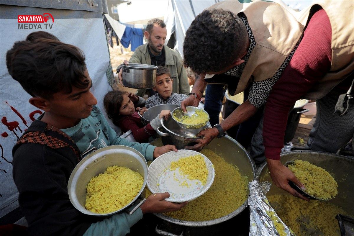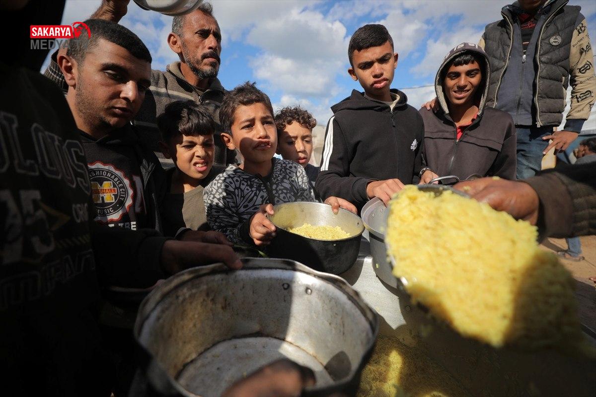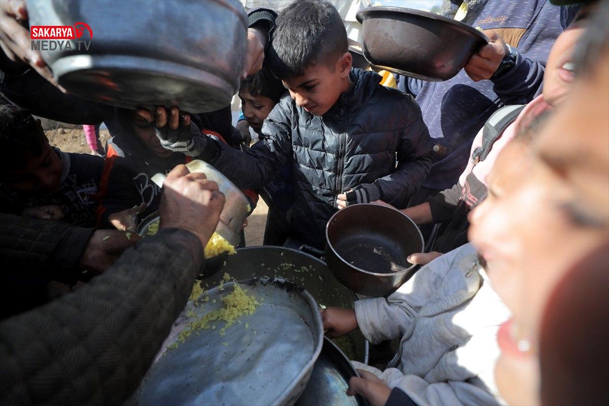 Aralarında çocukların da bulunduğu çok sayıda Filistinli, bir kap yemeğe ulaşabilmek için uzun kuyruklarda bekledi.