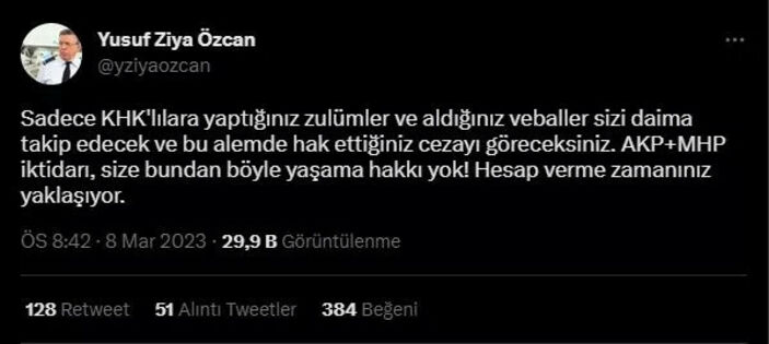 Özcan, Twitter hesabından yaptığı paylaşımda KHK’lılar üzerinden AK Parti ve MHP’yi hedef aldı.