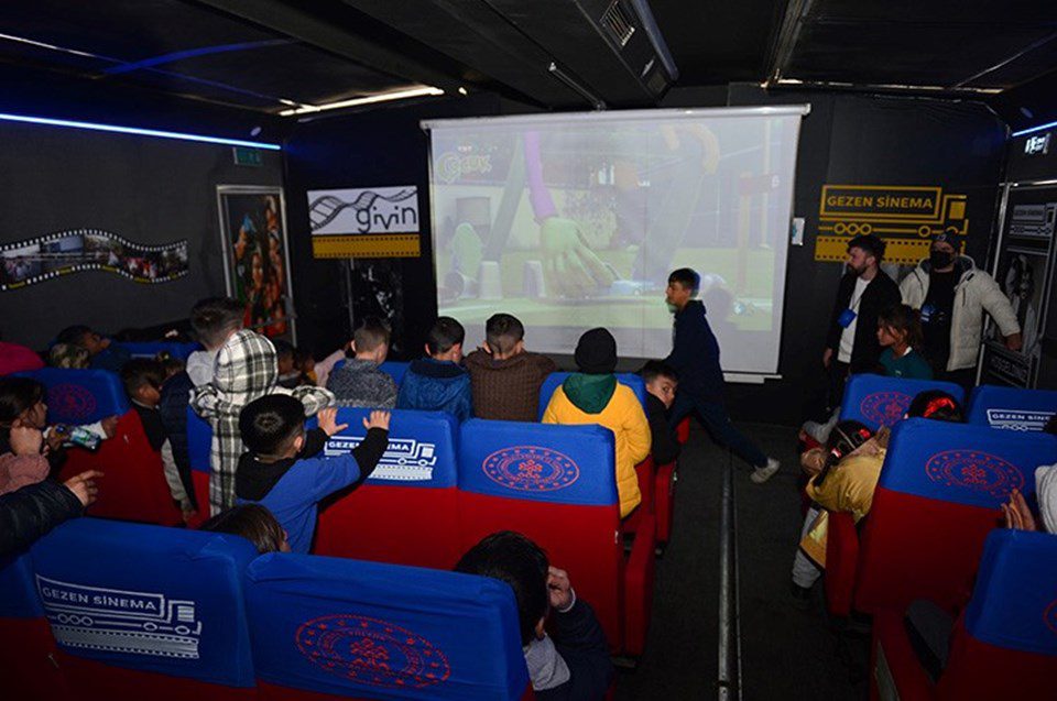 Tırımızda 120 çocuk kapasiteli sinema salonumuz var. Sadece koltuklara oturtup sinema izlettirmiyoruz. Dokunabildiğimiz kadar sanat dalı ile çocuklarla ilgileniyoruz.