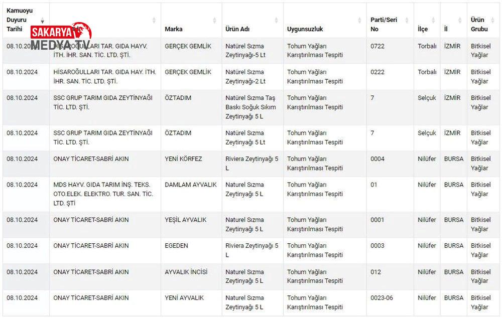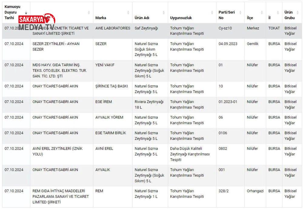 Tarım ve Orman Bakanlığı, taklit-tağşiş yapılan ve sıhhati tehlikeye düşürebilecek besinler listesini güncelledi. Halk sıhhatini tehlikeye atan firmaların listesi bakanlığın internet sitesinde kamuoyuyla paylaşıldı. Farklı bölgelerde faaliyet gösteren markaların eserlerinde salçada ve demlik poşet çayda besin boyasına rastlandı. Dün yayınlanan listedeyse zeytinyağları dikkat çekmişti. Zeytinyağına genelde tohum yağı karıştırıldığı ortaya çıktı. Sahtekarlık yapan firmaların “gerçek”, “hakiki” üzere markalar kullanması dikkat çekti.
