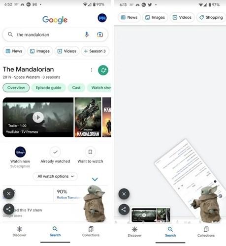 Ekranın sağ alt tarafında beliren Baby Yoda animasyonu bir süre sonra mavi ok göstermeye başlıyor. Karaktere dokunduğunuzda ilk önce The Mandalorian görsellerinin olduğu atlı karınca galeri sonucunu güç kullanarak yere indiriyor. Sonra yeniden mavi ok beliriyor ve yine karaktere dokunmanızı istiyor. Bu kez arama sonuçları penceresinin tamamını yerle bir ediyor. Oldukça hoş olan bu animasyonun masaüstü arama uygulamasında da yer aldığı ifade edilmiş.