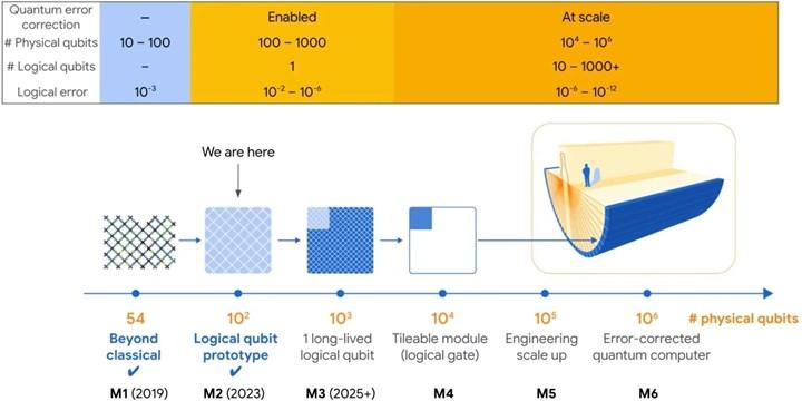 Google kendisi için 6 temel mihenk taşından oluşan bir kuantum bilişim yol haritası belirledi. İlk mihenk taşı “kuantum avantajı” olarak bilinen 2019 deneyiydi. İkincisi yapılan hata düzeltme başarısıydı. Google altıncı mihenk taşı için kodlanmış 1000 mantıksal kübiten ve 1 milyon fiziksel kübitten oluşan bir makine oluşturmak. Bu noktada Google ticari bir değerden söz etmenin mümkün olacağına inanıyor.