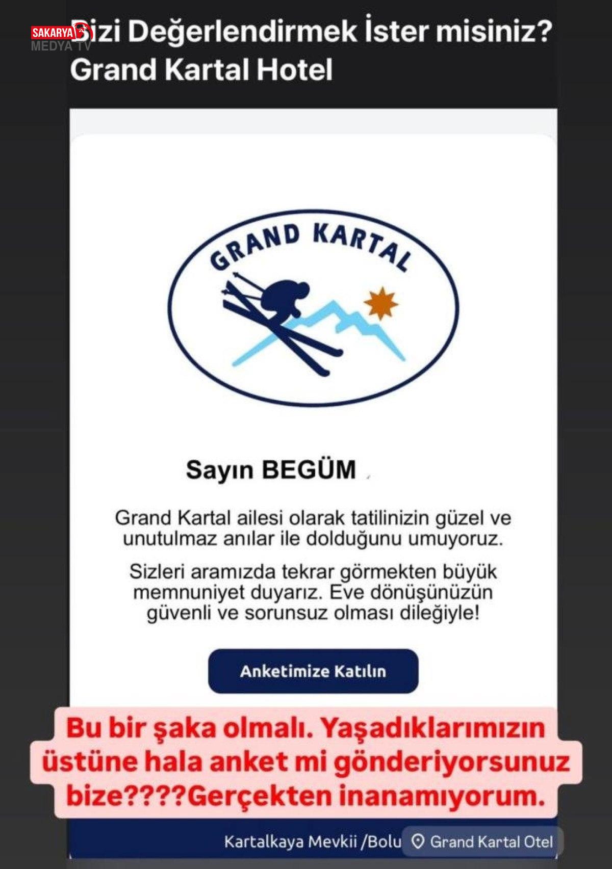 Onlarca canımızı hayattan koparan Grand Kartal Otel, müşterilerine gönderdiği bir kıymetlendirme paylaşımıyla reaksiyon topladı. Otel idaresi tarafından gönderilen bildiride, “Grand Kartal olarak tatilinizin hoş ve unutulmaz anılar ile dolduğunu umuyoruz.