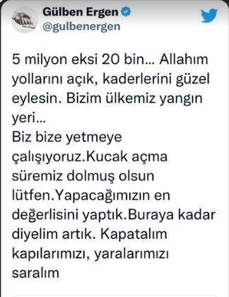 “5 milyon eksi 20 bin… Allah’ım yollarını açık, kaderlerini güzel eylesin. Bizim ülkemiz yangın yeri… Biz bize yetmeye çalışıyoruz. Kucak açma süremiz dolmuş olsun lütfen. Yapacağımızın en değerlisini yaptık. Buraya kadar diyelim artık. Kapatalım kapılarımızı, yaralarımızı saralım.”