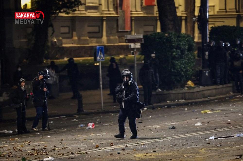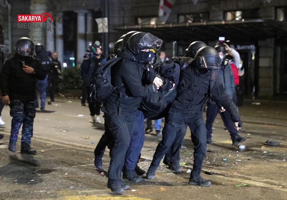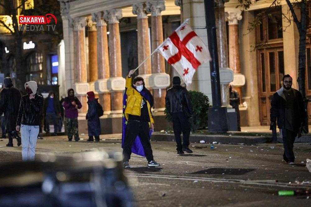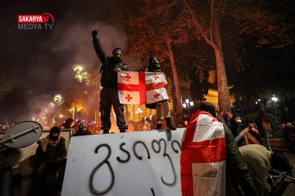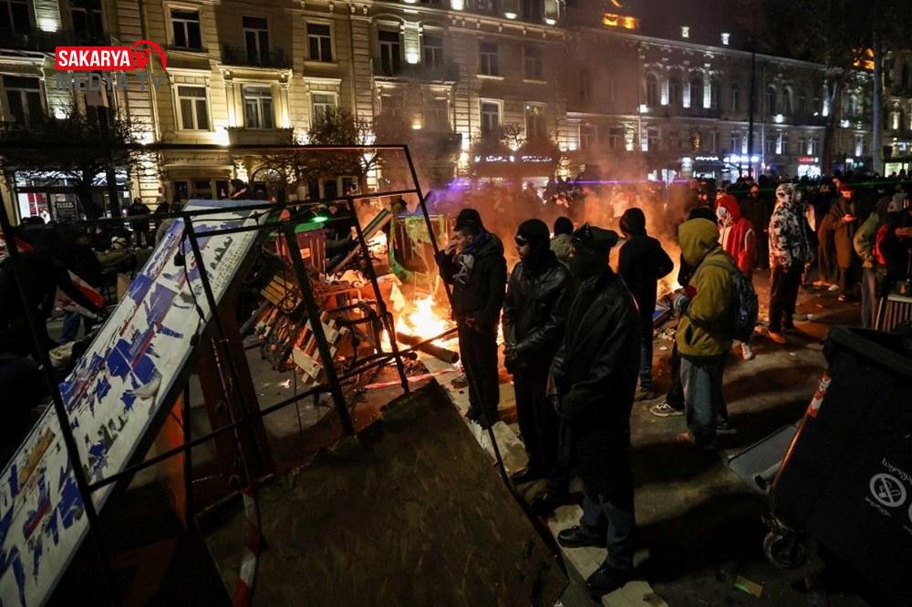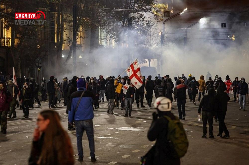 Gürcistan’da hükümet tersi protesto şovları 3. gecesinde de devam etti. Başbakan İraki Kobakhidze’nin AB iştirak müzakerelerini 2028’e kadar askıya alması kararını eleştiren göstericiler, 28 Kasım’da başlattıkları hareketlerini bugün de başşehir Tiflis’te sürdürdü. Parlamento binası etrafında ateş yakan göstericiler, hükümet aksisi slogan atıldı. Fırlatılan havai fişekler nedeniyle parlamento binasının bir kısmında küçük çaplı yangın çıktı. Göstericiler, ülkenin en zengini ve iktidardaki Gürcü Hayali Partisi’nin kurucusu Bidzina Ivanishvili’nin kuklasını yaktı. Polis göz yaşartıcı gaz, biber gaz ve tazyikli su ile müdahale ederken göstericiler hem parlamento binasına yanlışsız hem de polislerin üzerine farklı eşyalar fırlatarak karşılık verdi.