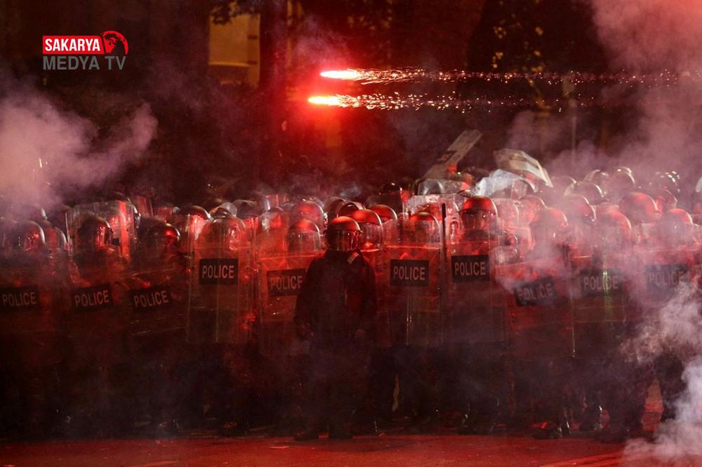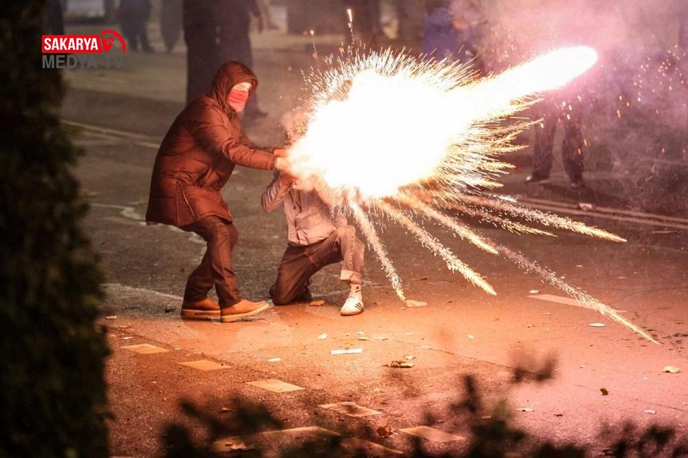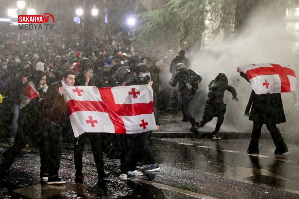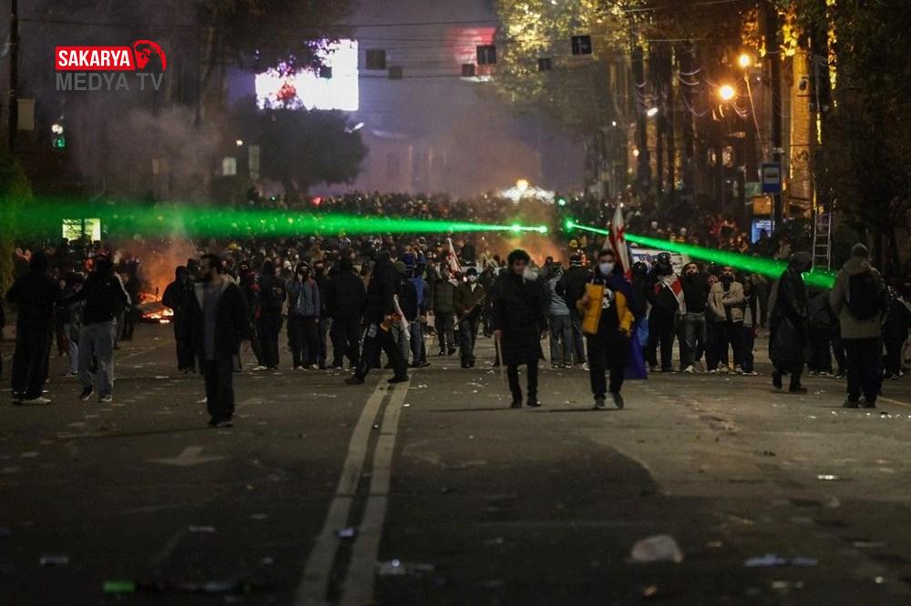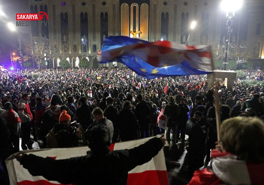 Gürcistan’da hükümet tersi protesto şovları 3. gecesinde de devam etti. Başbakan İraki Kobakhidze’nin AB iştirak müzakerelerini 2028’e kadar askıya alması kararını eleştiren göstericiler, 28 Kasım’da başlattıkları hareketlerini bugün de başşehir Tiflis’te sürdürdü. Parlamento binası etrafında ateş yakan göstericiler, hükümet aksisi slogan atıldı. Fırlatılan havai fişekler nedeniyle parlamento binasının bir kısmında küçük çaplı yangın çıktı. Göstericiler, ülkenin en zengini ve iktidardaki Gürcü Hayali Partisi’nin kurucusu Bidzina Ivanishvili’nin kuklasını yaktı. Polis göz yaşartıcı gaz, biber gaz ve tazyikli su ile müdahale ederken göstericiler hem parlamento binasına yanlışsız hem de polislerin üzerine farklı eşyalar fırlatarak karşılık verdi.