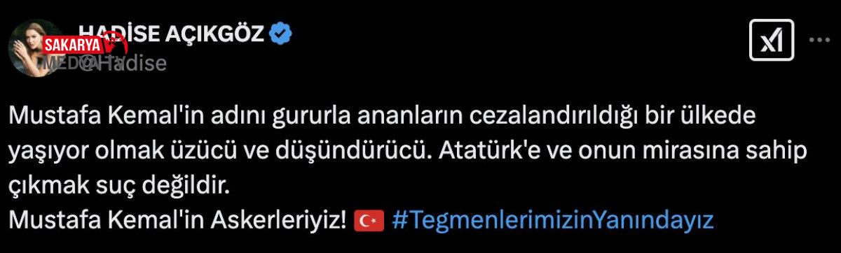 Hadise, sosyal medyadan yaptığı paylaşımda, “Mustafa Kemal’in adını gururla ananların cezalandırıldığı bir ülkede yaşıyor olmak üzücü ve düşündürücü.” ifadelerini kullandı.