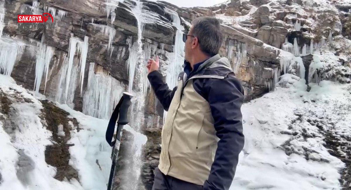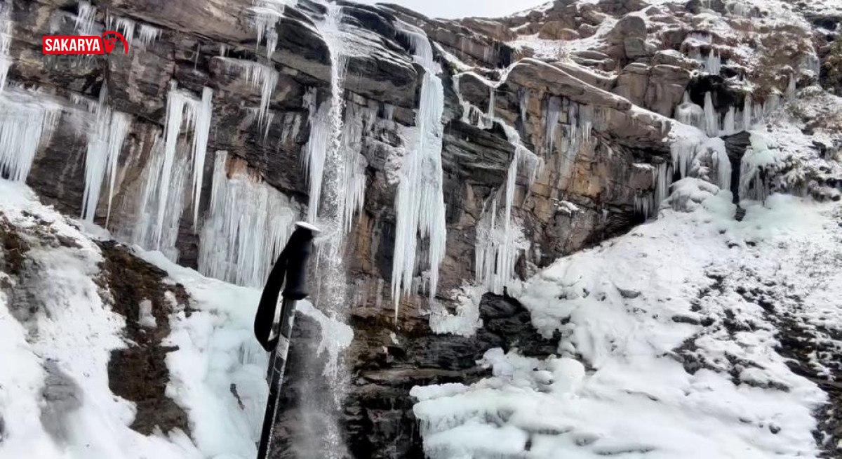 Şelale büsbütün donmuş ve buz sarkıtları oluşmuş durumda. Nereden bakarsan 4 metreyi buluyor.