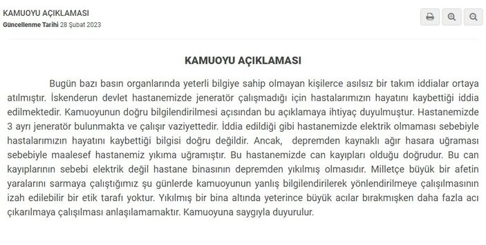 Bugün bazı basın organlarında yeterli bilgiye sahip olmayan kişilerce asılsız bir takım iddialar ortaya atılmıştır. İskenderun devlet hastanemizde jeneratör çalışmadığı için hastalarımızın hayatını kaybettiği iddia edilmektedir. Kamuoyunun doğru bilgilendirilmesi açısından bu açıklamaya ihtiyaç duyulmuştur.