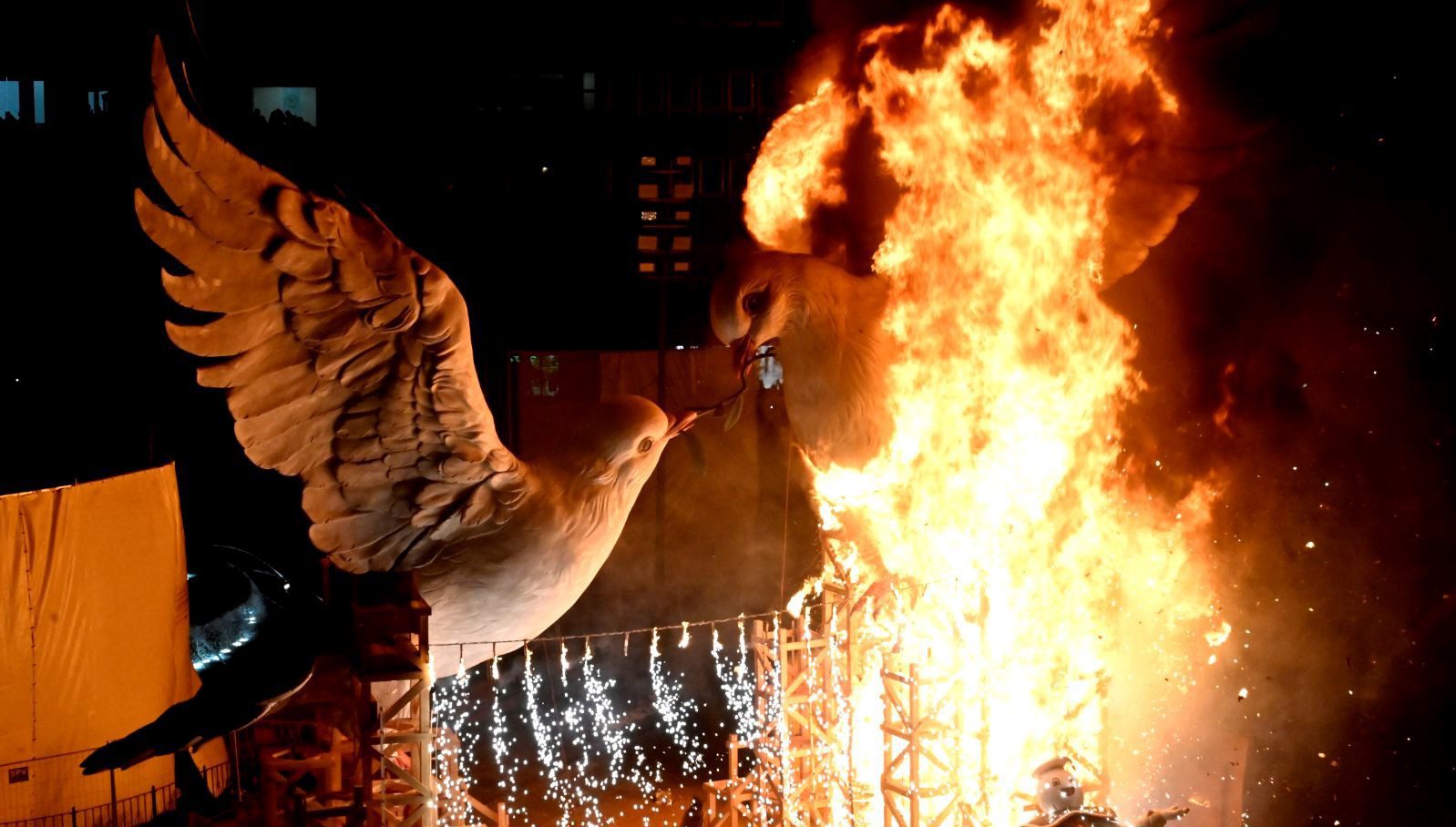 İspanya’da tahtadan dev güvercinler Gazze ve Ukrayna’da barış için yakıldı