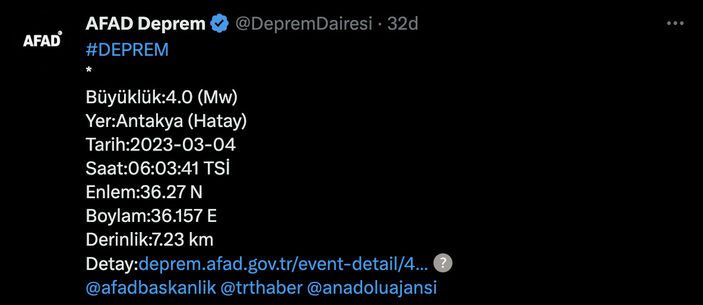 Hatay’ın Antakya ilçesinde saat 06.03’te 4 büyüklüğünde deprem meydana geldi. Afet ve Acil Durum Yönetimi Başkanlığının (AFAD) internet sitesinde yer alan bilgiye göre sarsıntı 7,23 kilometre derinlikte gerçekleşti.
