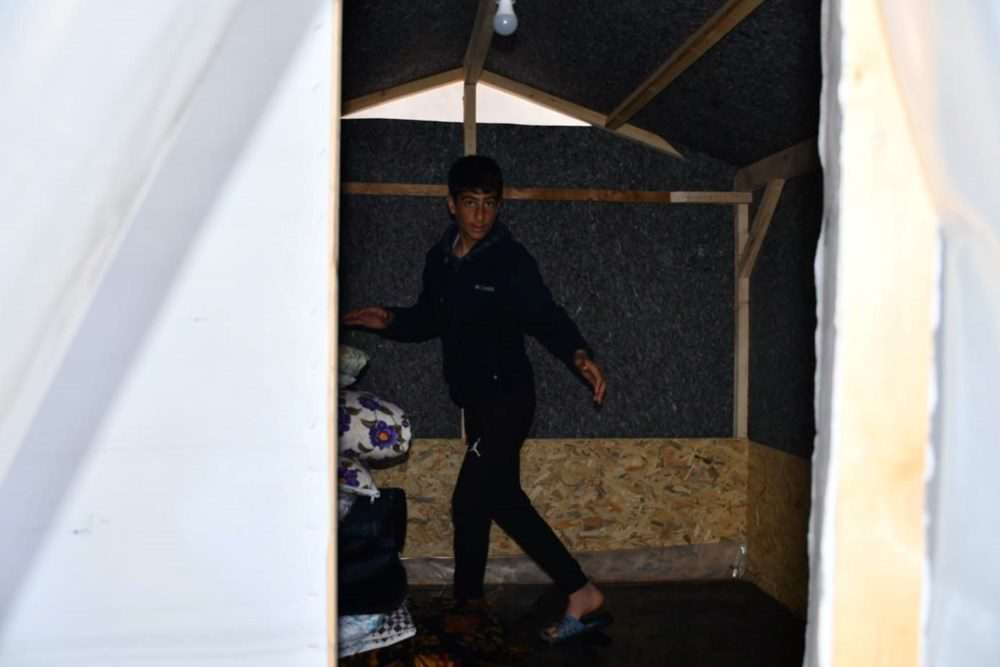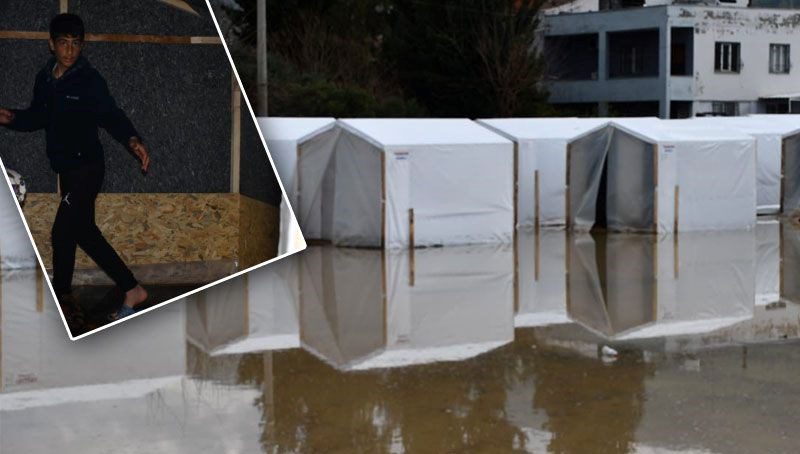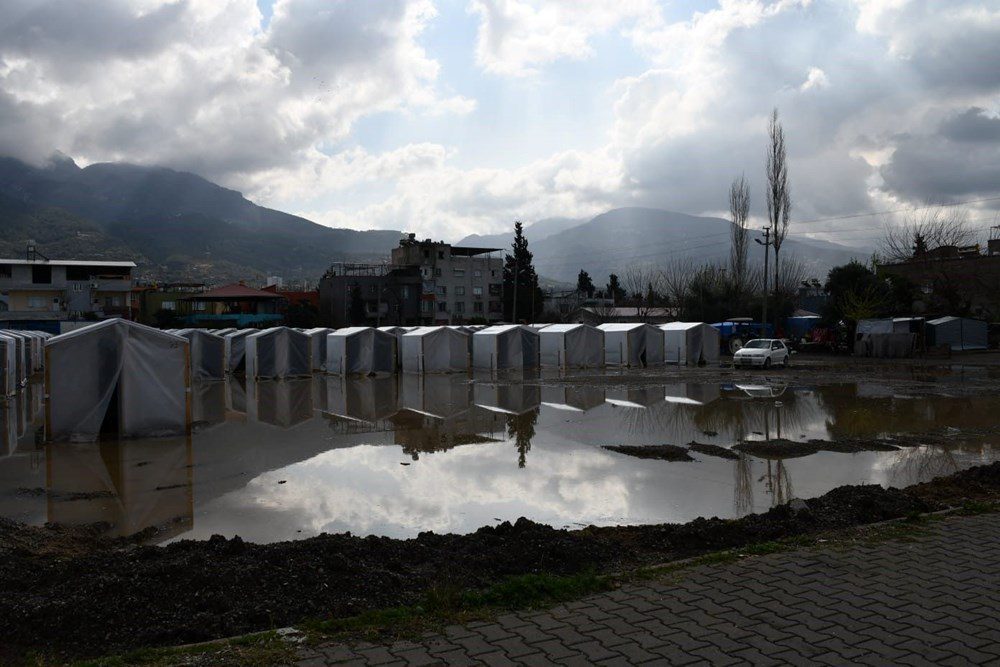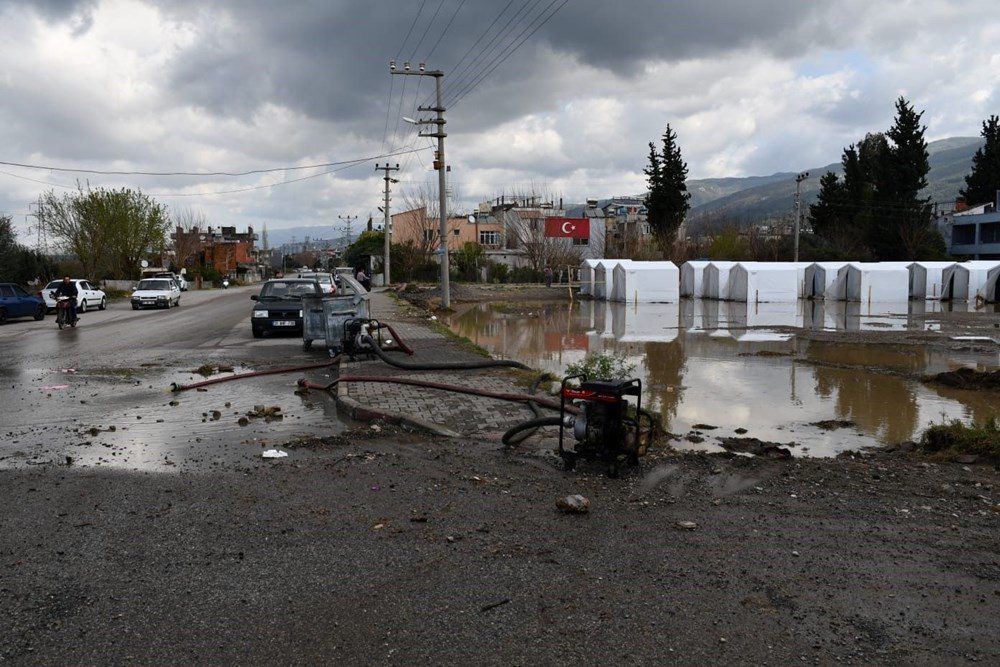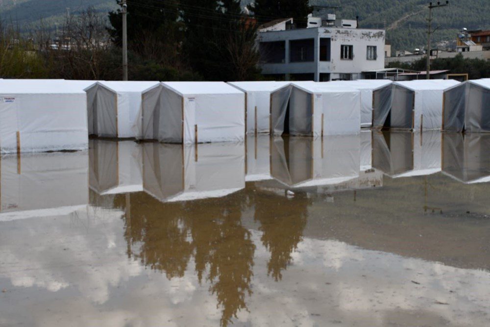 Payas ilçesinde gece etkili olan yağmur, Yıldırım Beyazıt Mahallesi’ndeki çadır kentte kalan vatandaşları zor durumda bıraktı.