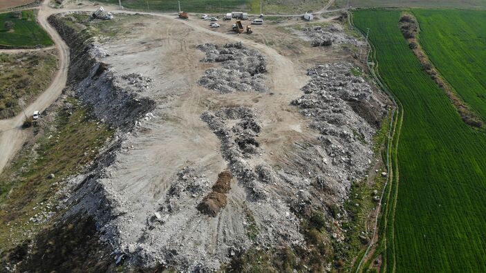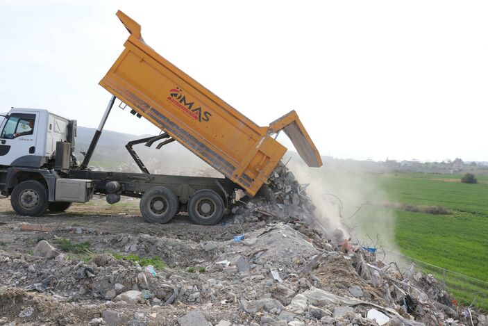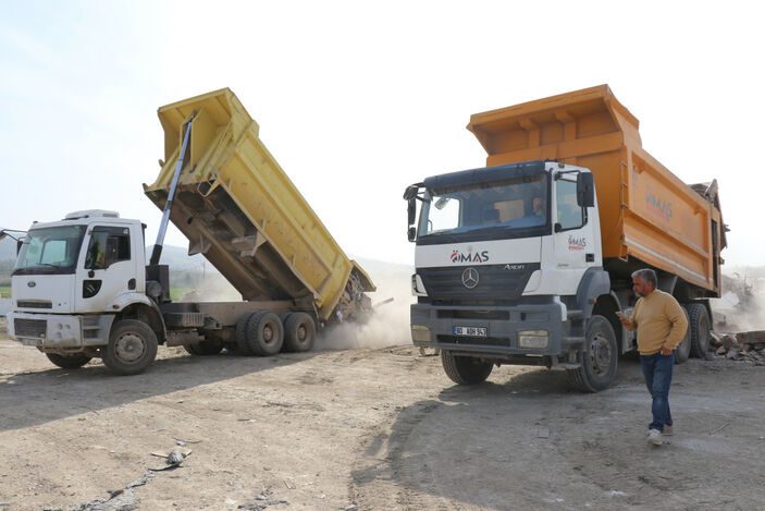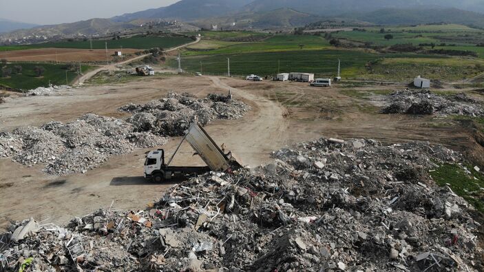 Kent merkezinde kamyonlara yüklenen enkazların belirlenen alana dökümü dron ile havadan görüntülendi.