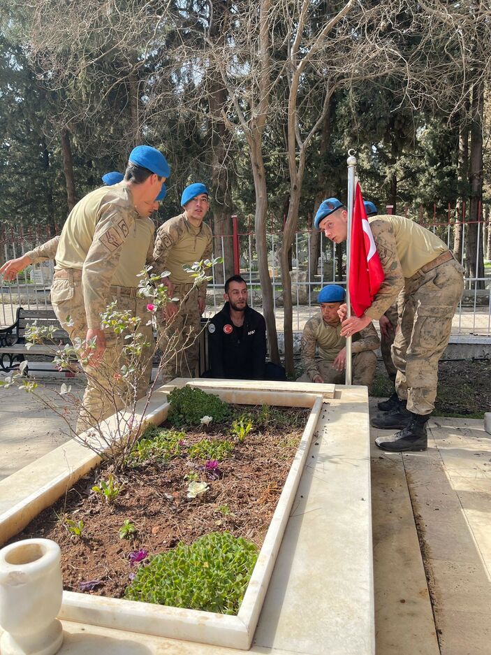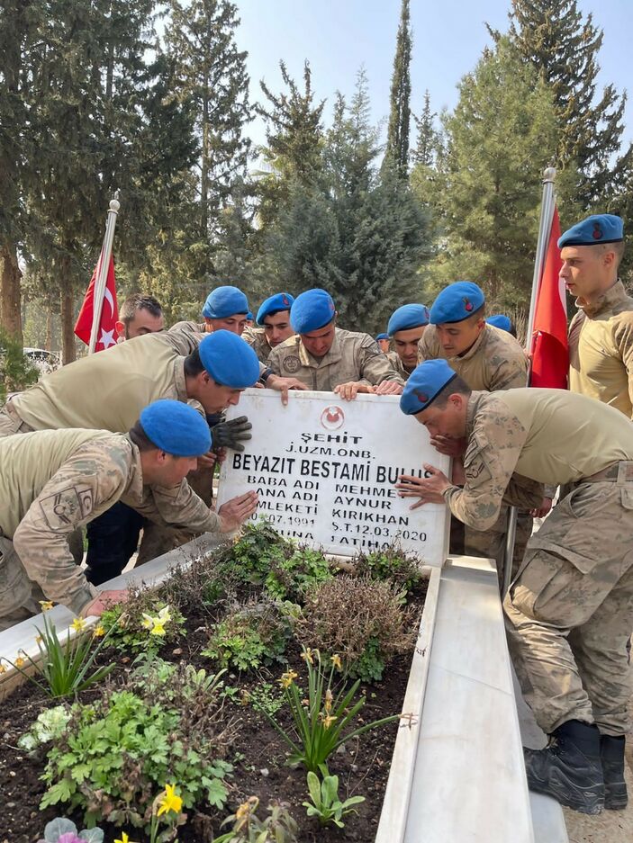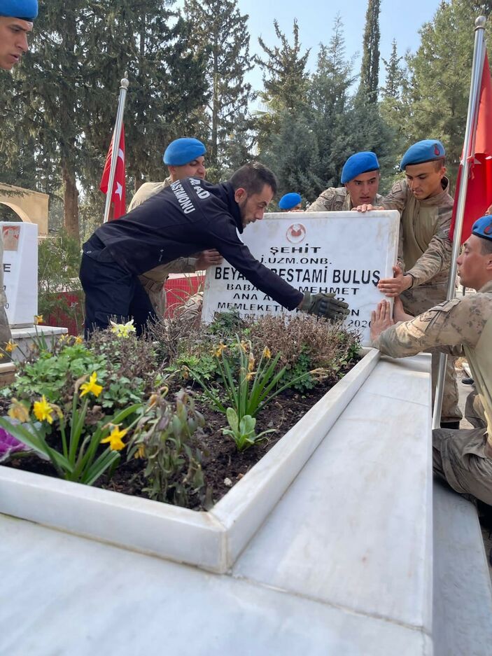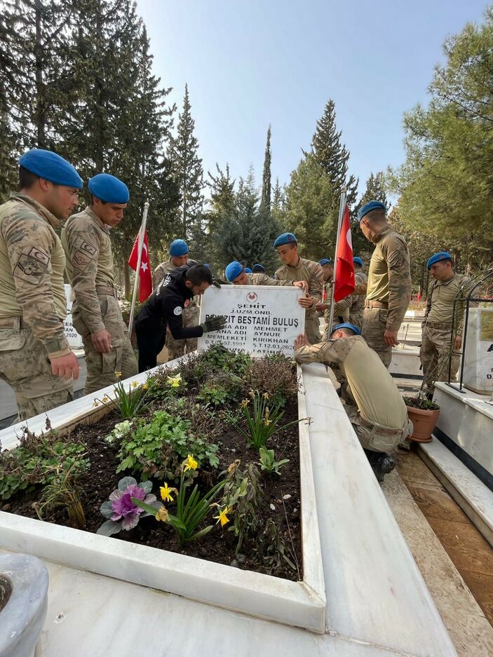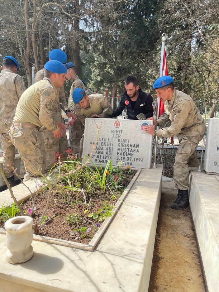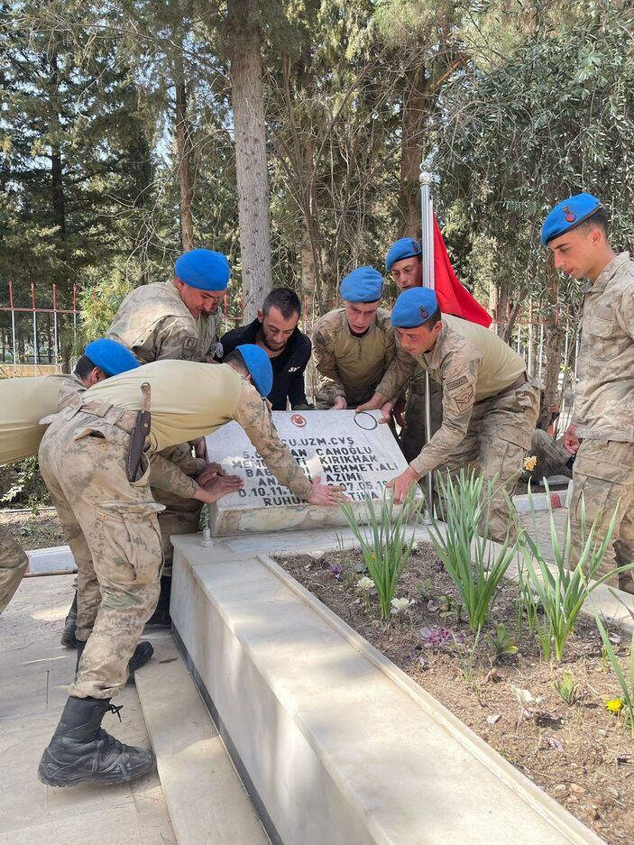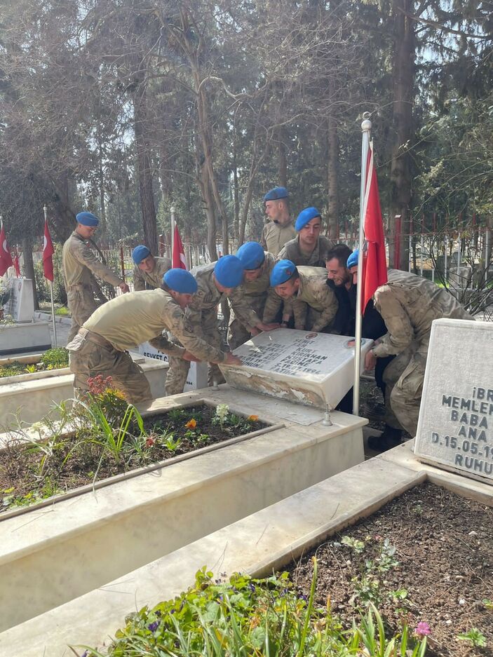 Hatay’ın Kırıkhan ilçesinde enkaz kaldırma çalışmalarının yanı sıra tahrip alanlarda da çalışma yapan Kastamonu jandarma komando ve Kastamonu AFAD ekibi, Kırıkhan Şehitliği’nde yıkılan mezarları onardı.