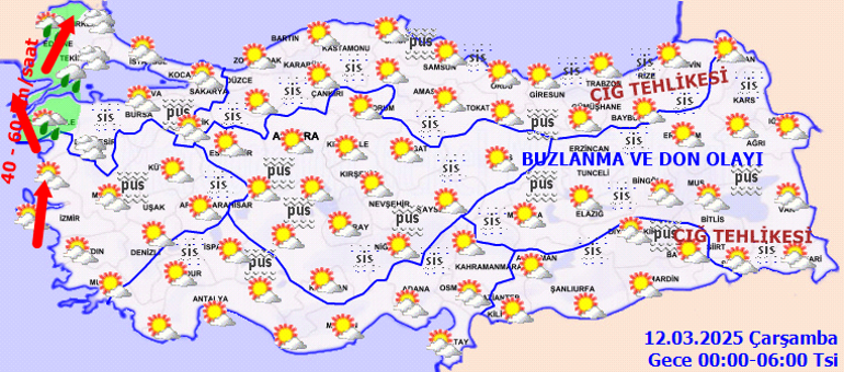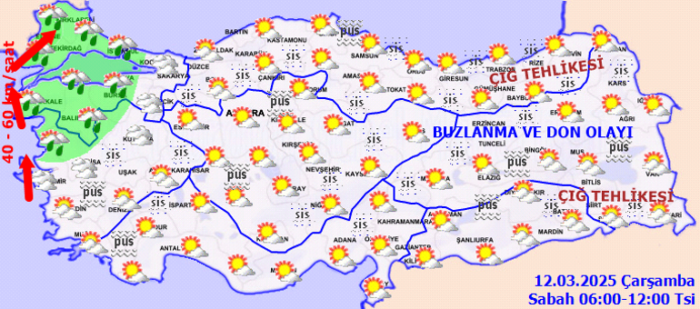 Meteoroloji Genel Müdürlüğü tarafından yapılan iddialara nazaran, Yurdun batı bölümleri ile Doğu ve Güneydoğu Anadolu’nun kesimli, yer yer çok bulutlu, Marmara’nın batısı ile İstanbul, Bursa ve Yalova etrafları ile İzmir’in kuzey bölümlerinin sağanak yağışlı, başka yerlerin az bulutlu ve açık geçeceği iddia ediliyor. Gece ve sabah saatlerinde doğu kesitlerde buzlanma ve don olayı, yurt genelinde pus ve yer yer sis bekleniyor. Doğu Karadeniz’in iç kısımlarının yüksekleri ile Doğu Anadolu’nun yüksek ve eğimli yamaçlarında çığ tehlikesi bulunmaktadır.