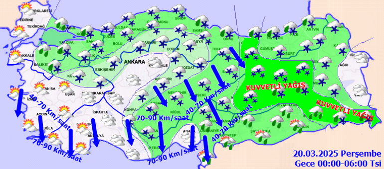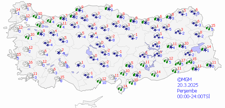 Meteoroloji Genel Müdürlüğü tarafından yapılan kestirimlere nazaran, ülkemiz genelinin modüllü ve çok bulutlu, Marmara’nın doğusu, Doğu Akdeniz, İç Anadolu, Karadeniz, Doğu ve Güneydoğu Anadolu’nun yağışlı geçeceği varsayım ediliyor. Ekseriyetle karla karışık yağmur ve kar, Akdeniz kıyıları ile Güneydoğu Anadolu’da yağmur ve sağanak halinde görülmesi beklenen yağışların, Doğu Akdeniz, İç Anadolu’nun doğusu, Doğu Karadeniz, Doğu Anadolu’nun batısı, Samsun, Sinop, Ordu, Şırnak, Hakkâri, Batman ve Siirt etrafları ile Diyarbakır’ın doğusunda yer yer kuvvetli olacağı iddia ediliyor. Gece ve sabah saatlerinde iç ve doğu kesitlerde buzlanma ve don bekleniyor. Doğu Karadeniz ile Doğu Anadolu’nun yüksek kar örtüsüne sahip eğimli yamaçlarında çığ tehlikesi bulunmaktadır.