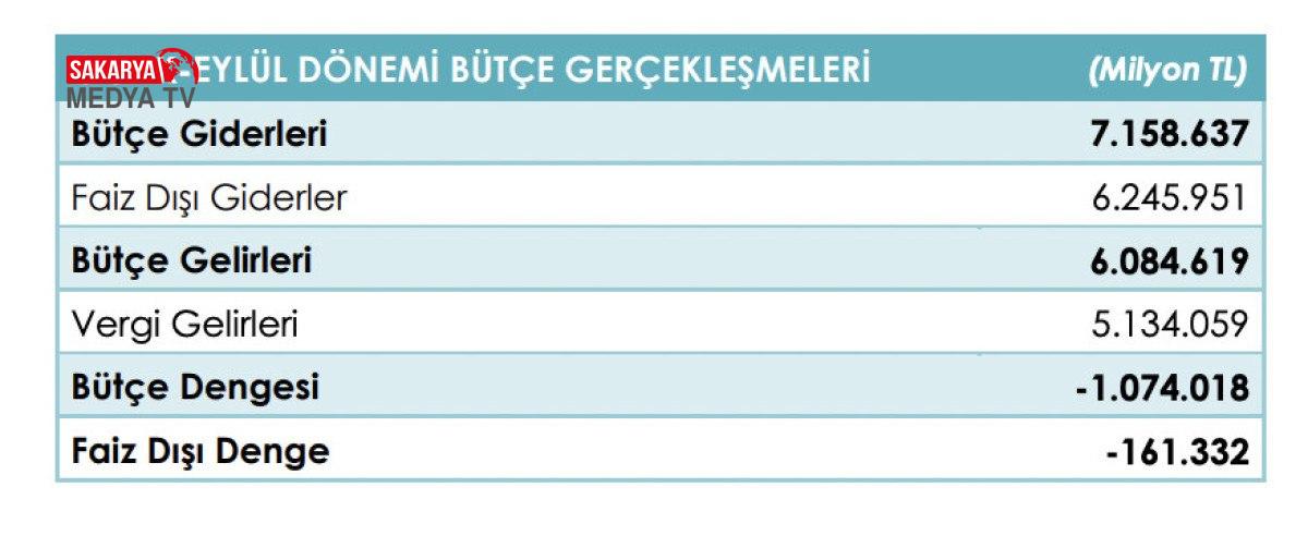 Merkezi idare bütçesi 2023 yılı Eylül ayında 129 milyar 218 milyon TL açık vermiş iken 2024 yılı Eylül ayında 100 milyar 464 milyon TL açık verdi. 2023 yılı Eylül ayında 58 milyar 454 milyon TL faiz dışı açık verilmiş iken 2024 yılı Eylül ayında 48 milyar 213 milyon TL faiz dışı fazla verdi.