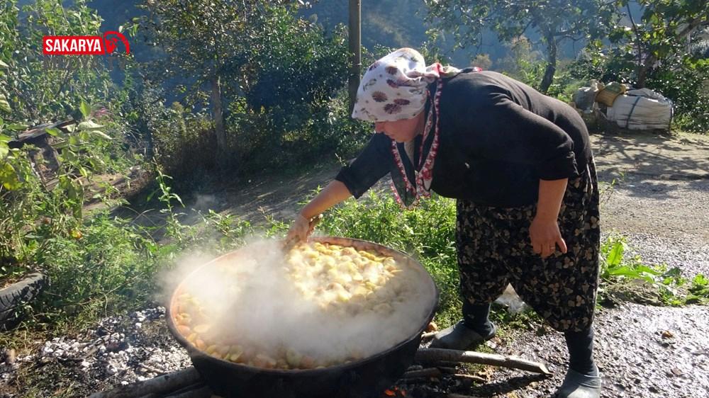 Biz de köyümüzde komşularımızla yardımlaşarak bahçelerimizden topladığımız elmaları pekmeze dönüştürüyoruz.