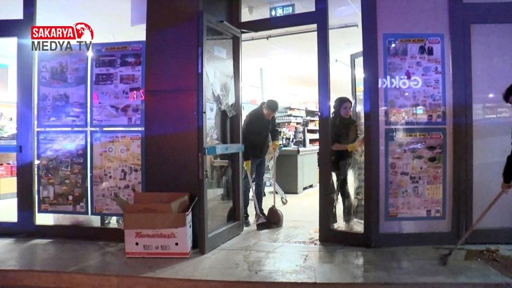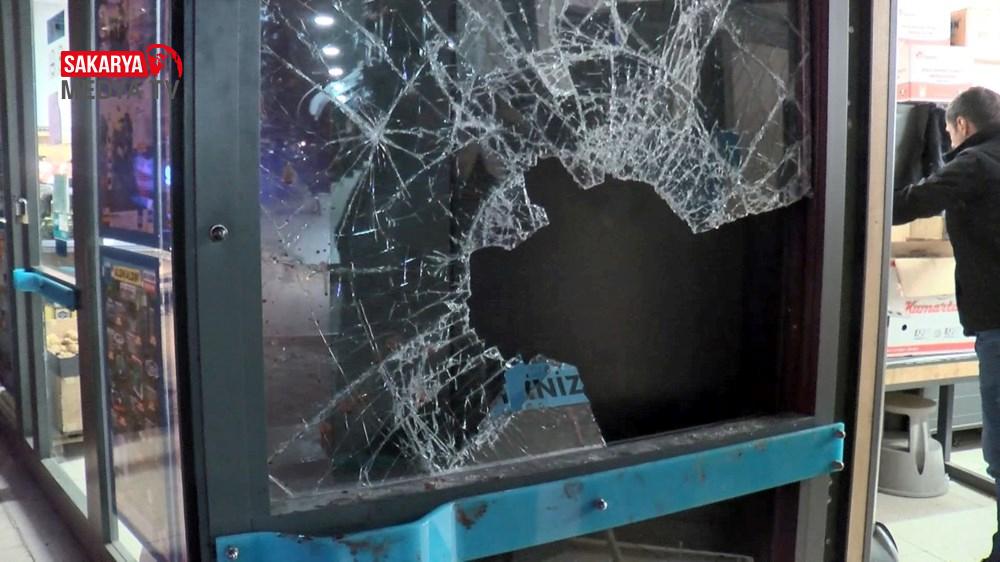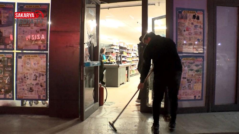 Çalışanlar tarafından markete kilitlenen şüphelilerden biri yangın tüpüyle camı kırdı. Olay yerine gelen polis grupları tarafından gözaltına alınan şüpheliler polis merkezine götürülürken polis iş yerinde bulunan güvenlik kameralarını incelemeye aldı.
