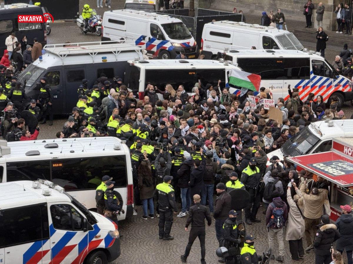 Göstericiler, müdahale öncesinde “Özgür Filistin”, “Hollanda utan, ellerin kanlı”, “İnsanlar birleşti” ve “Halklar birliktir, biz yenilmeyeceğiz” sloganları attı.