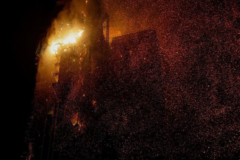 Çevre sokaklara kıvılcımlar ve yanan bina kaplamaları düştü.