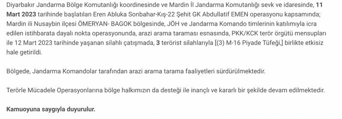 Diyarbakır Jandarma Bölge Komutanlığı koordinesinde ve Mardin İl Jandarma Komutanlığı sevk ve idaresinde, 11 Mart 2023 tarihinde başlatılan Eren Abluka Sonbahar-Kış-22 Şehit GK Abdullatif EMEN operasyonu kapsamında; Mardin ili Nusaybin ilçesi ÖMERYAN- BAGOK bölgesinde, JÖH ve Jandarma Komando timlerinin katılımıyla icra edilen istihbarata dayalı nokta operasyonunda, arazi arama taraması esnasında, PKK/KCK terör örgütü mensupları ile 12 Mart 2023 tarihinde yaşanan silahlı çatışmada, (3) terörist silahlarıyla [(3) M-16 Piyade Tüfeği,] birlikte etkisiz hale getirilmiştir.