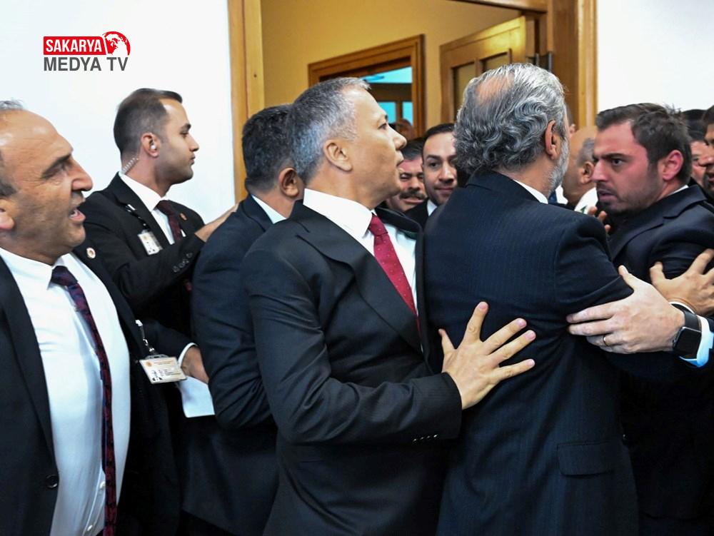 Bakan Yerlikaya arbede sonrasında salona giriş yaparken, gerginlik burada da sürdü.