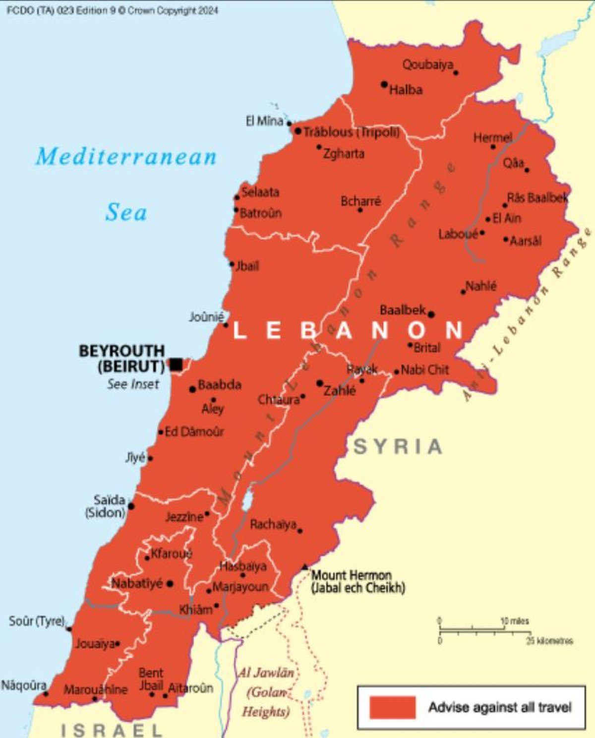 İngiliz vatandaşlarından Lübnan’ı terk etmeleri istenen açıklamada, “FCDO, İsrail, Lübnan Hizbullahı ve Lübnan’daki öbür devlet dışı aktörler ortasında devam eden çatışmalarla ilgili riskler nedeniyle Lübnan’a seyahat edilmemesini ve Lübnan’da bulunan herkesin ülkeyi derhal terk etmesini tavsiye etmektedir.