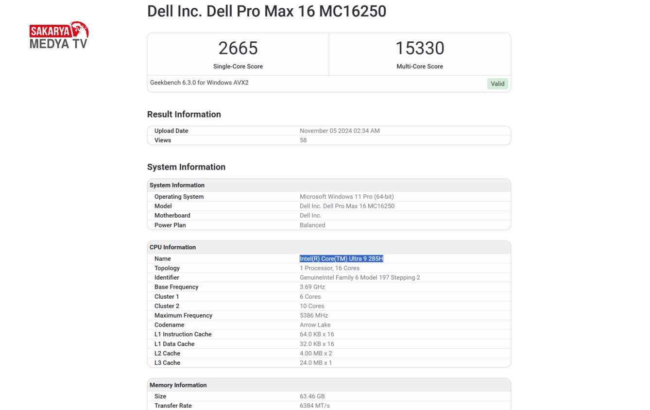 Bu da ismine bakılırsa iş istasyonu odaklı bir sistem olacak. Sonuçlara gelirsek, Intel Core Ultra 9 285H, Geekbench’in tek çekirdek testinde 2.665, çoklu çekirdek testinde ise, 15.330 puan alıyor.