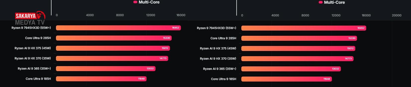 Bu da halefi olduğu 185H’a kıyasla tek çekirdekte %18.9, çoklu çekirdekte ise, %28 oranında daha yüksek. Okları AMD Ryzen AI 9 HX 370’e çevirdiğimizde ise, Intel Core Ultra 9 285H tek çekirdek performansında biraz geride kalıyor ancak daha hızlı çok iş parçacıklı performans sunuyor.