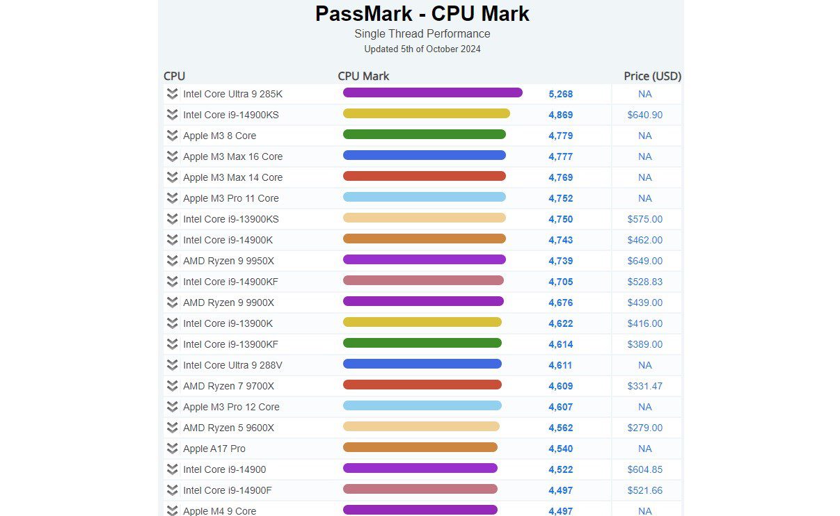 Sonuçlara gelirsek performans açısından Intel Core Ultra 9 285K CPU, PassMark’ın tek iş parçacıklı karşılaştırmasında 5.268 puan alıyor. Bunun Core i9-14900KS’den %8,2 daha hızlı olduğunu belirtelim. Üstelik 14900KS 6,2GHz saat hızına sahip. Okları Ryzen 9 9950X’e çevirdiğimizde ise, 285K’nın %11 daha yüksek puana sahip olduğunu görüyoruz. Çok iş parçacıklı testlere gelirsek, işlemci 46.872 puan alıyor. Bu, sırasıyla 60.305 (+%28,6) ve 66.702 (+%42,3) puan alan Core i9-14900K ve Ryzen 9 9950X’ten daha düşük. Ancak bu farkın ana nedeni, Arrow Lake işlemcilerin hyper-threading desteğine sahip olmaması. Keza Ultra 9 285K, Intel 14. nesil ve AMD Zen 5 işlemcilerde bulunan 32 iş parçacığına kıyasla 24 iş parçacığı sunuyor.